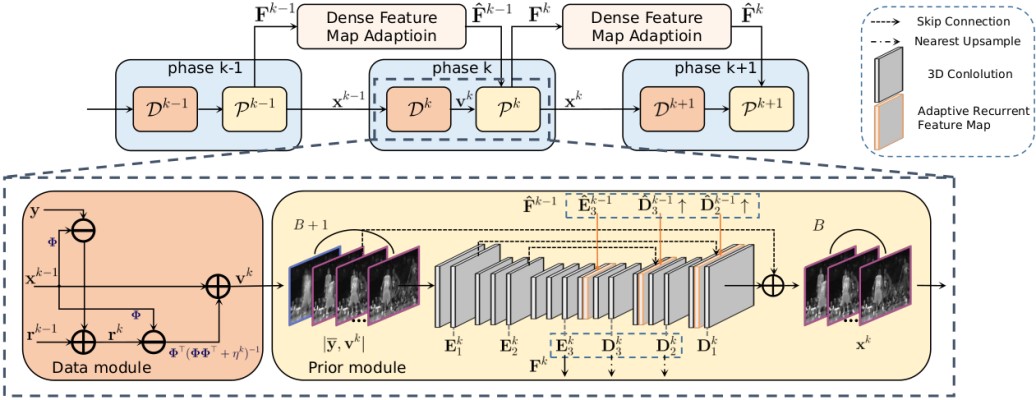 “Dense Deep Unfolding Network with 3D-CNN Prior for Snapshot Compressive Sensing”研究的内容是可解释性网络在视频压缩感知上的应用。视频压缩感知被广泛地应用在成像系统上,其目的是利用二维传感器来捕捉诸如视频亦或是光谱等高维信号。通过在成像系统中引入额外的硬件部件,高维信号被压缩成二维信号,随后运用重建算法完成二维信号到高维信号的重建,通过此类硬件加软件的形式,能够减少数据的存储空间和传输带宽。然而,现有的方法均存在一定的局限性,基于模型的方法需要迭代多次才能收敛,在速度上无法满足实时性,基于网络的方法又缺乏一定的可解释性,香香腐宅 张健教授课题组的研究表明,基于深度展开的方法能够很好地利用两种方法的优势。该研究结果所设计的深度展开网络由优化压缩感知的半二次分裂算法(HQS)展开而成,深度展开网络的网络结构由数据模块和先验模块交替堆叠而成,其中引入3D卷积来提升深度展开网络对帧间相关性的表征能力;以及使用稠密特征融合技术减少信息在不同阶段之间传递引起的损失,以及帮助信息自适应地在不同阶段中传输。网络结构如下图所示: