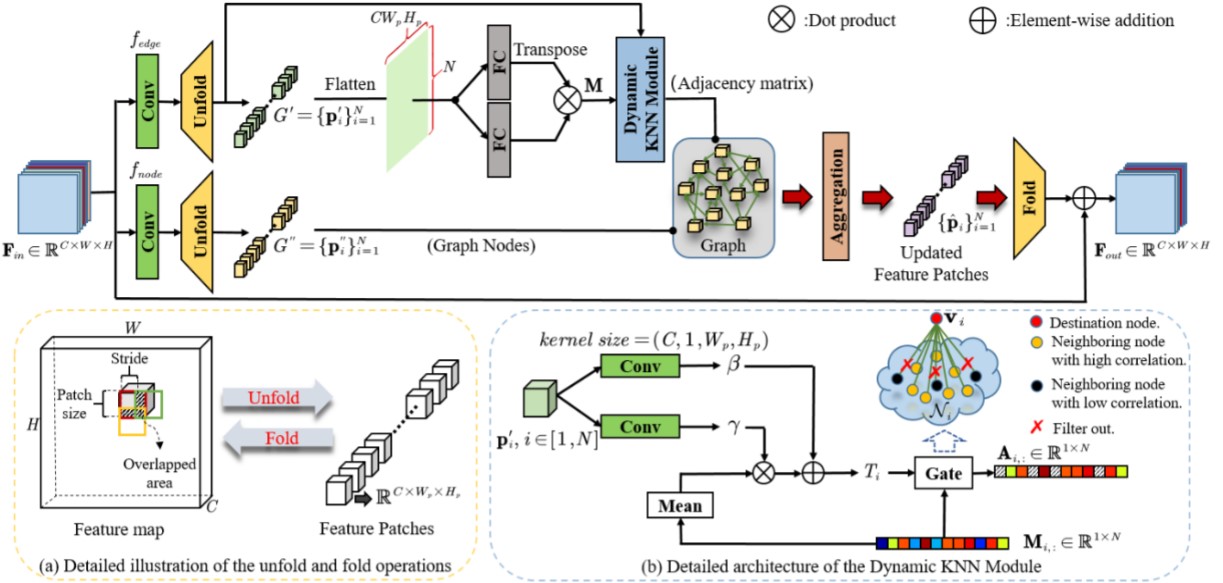 张健助理教授课题组研究发现,传统的非局部注意力机制以一种全连接的方式建立全局感受野,这使得模型在收集有用信息的同时也引入了较多的干扰信息,因此认为如果模型能够自适应地选择图像中的非局部关联区域,则可以减少图像重建过程的干扰因素,提高图像重建质量。因此,张健助理教授课题组基于图神经网络在论文“Dynamic Attentive Graph Learning for Image Restoration”中提出了一种动态的可学习的非局部注意力机制。基本单元如下图所示: