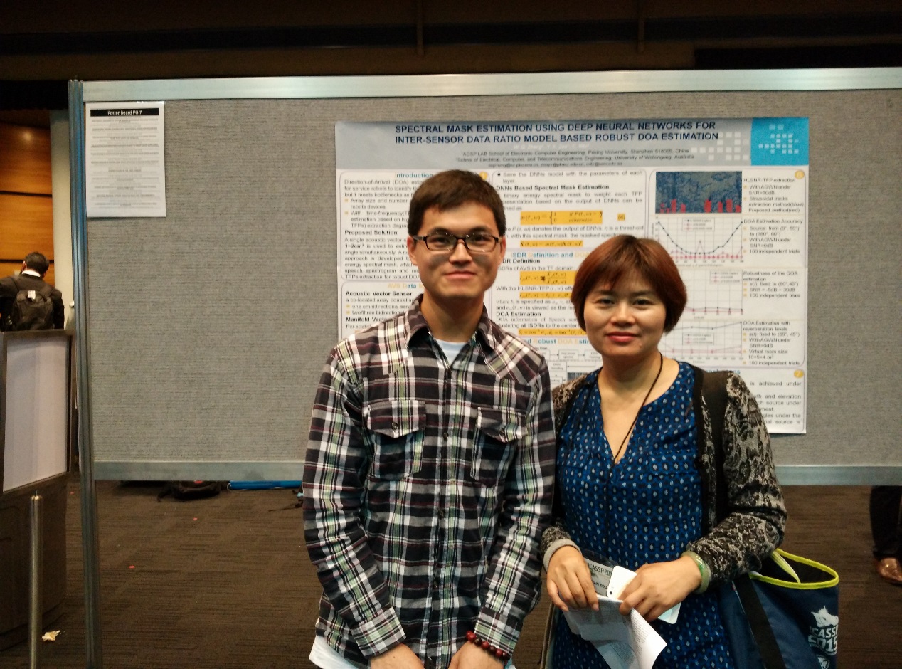 ADSP实验室邹月娴教授带领实验室郑炜乔同学,参加了著名而具有悠久历史的第四十届语音信号处理国际顶级会议ICASSP2015(the 40th IEEE International Conference on Acoustics, Speech and Signal Processing)。本次大会由IEEE Signal Processing Society主办,于2015年4月19日到24日在澳大利亚布里斯班召开。ICASSP是国际声学语言和信号处理的旗舰会议,其学术水平和影响力在语音信号处理领域属于最重要的国际会议,每届盛会都吸引很多来自不同国家和地区高校、研究机构和相关产业界的著名专家和学者参会,展示信号和信息处理的最新研究成果,讨论科技和产业发展趋势。会议论文水平高,EI收录,优秀论文推荐至SCI国际期刊发表,国际影响力高。