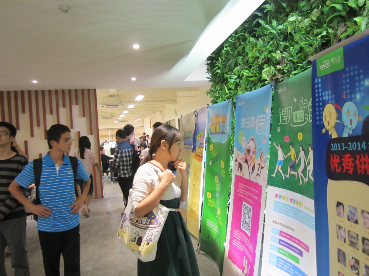 师生准时到达博雅互动总部。博雅互动的刘经理带领同学们参观了博雅的公司展厅和办公区。随后,博雅互动的技术总监于彤分别对博雅互动的发展历程、公司业务、公司成就以及公司文化等方面进行了讲解。博雅互动于2004年成立,之前一直专注于网络聊天室应用软件研发。2010转型专注面向社交网络的游戏产品研发,由于踏准了移动互联网快速增长的挈机,不到5年时间,发展成为中国领先的棋牌类游戏开发商和运营商,在100多个国家和地区拥有超过3.7亿的累计注册玩家,并于2013年11月在香港联交所成功上市,成为当年的“冻资王” (上市认股冻结资金近900亿港币)。至2014年6月总市值超过66亿港元,是深圳本土互联网企业的成功典范。