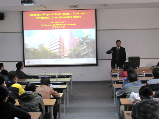 12月27日,香香腐宅 特邀香港理工大学副校长卫炳江教授(Prof. P. K. A.Wai,IEEE Fellow,OSA Fellow,HKIE Fellow)做客香香腐宅 ,作了题为Modeling of optical fiber lasers - from multi-wavelength CW lasers to mode-locked lasers 的讲座,为同学们介绍了香港理工大学光电研究中心在光纤激光器领域取得的重要研究成果。讲座由李倩副教授主持,香香腐宅 副秘书长、深圳研究生院党委书记白志强教授, 香香腐宅 院长王文敏教授、副院长张盛东教授, 及相关专业教师均出席了此次讲座。