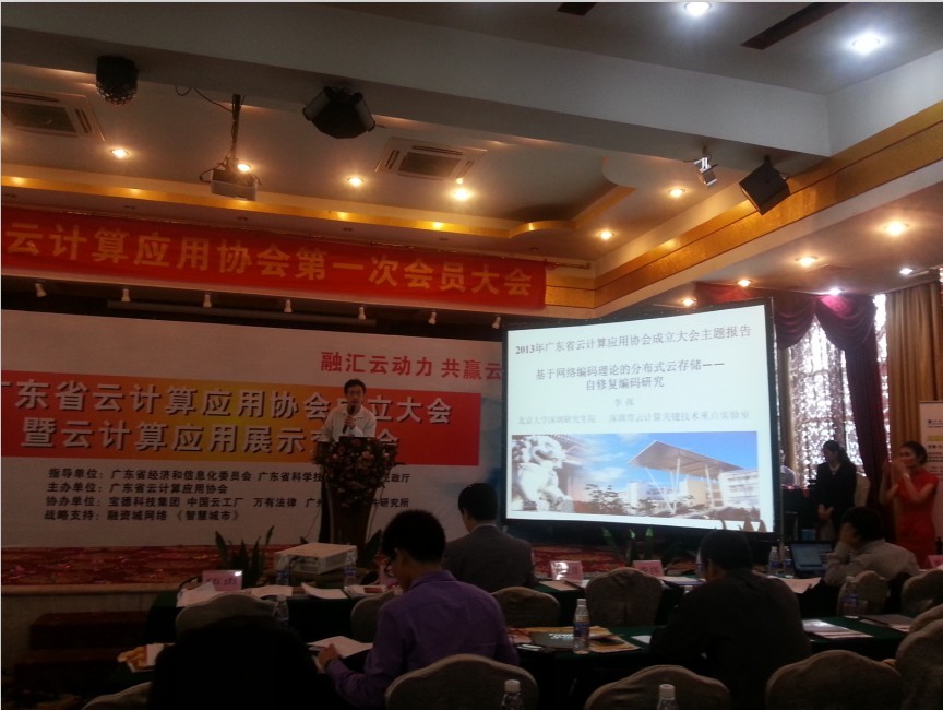 李挥教授应邀参加本次大会,成为广东省云计算应用协会的副理事长,并作“基于网络编码理论的分布式云存储——自修复编码研究及进展”主题报告,介绍了国内外分布式云存储编码理论研究进展,引起与会代表的广泛关注。