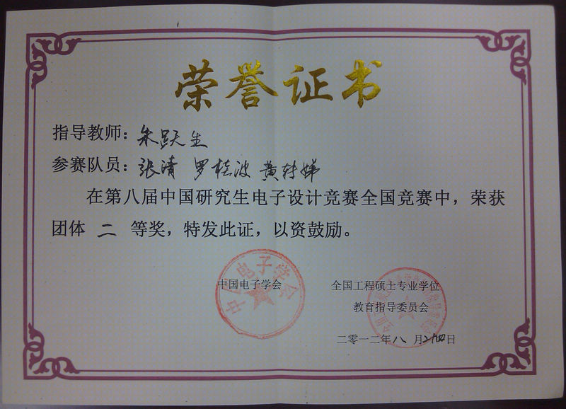 参赛队伍获得优异成绩。通信与信息安全实验室的张清、罗桂波和黄转娣3名研究生的参赛项目 “基于特征融合的视觉跟踪系统的设计与实现”获团体二等奖,该队指导教师朱跃生教授获得优秀指导老师奖。在此前举行的华南赛区初赛中,该队以华南赛区第一的佳绩进入全国决赛。
