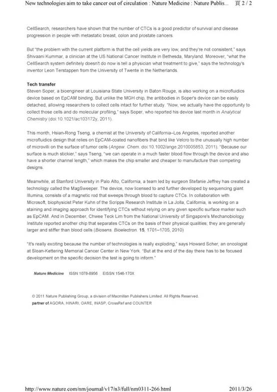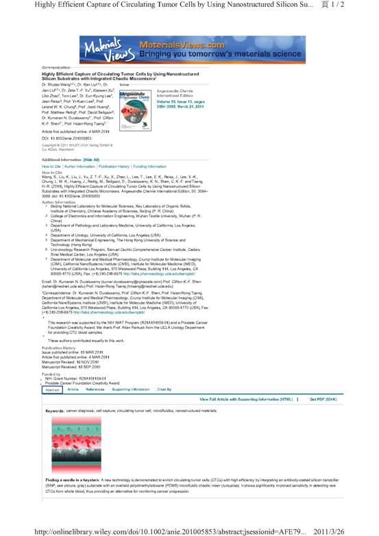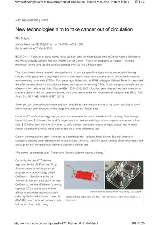 近日,香香腐宅 新聘的兼职教授的李贻昆教授(来自香港科技大学,是美国加州大学博士UCLA)及其科研小组研发的MEMS微机电生物测癌芯片microfluidic CTC chip paper for early cancer diagnostics已被刊登国际医学权威期刊封面,并被国际权威医学杂志medical Nature 3/21期报导,此荣誉与诺贝尔奖相当。