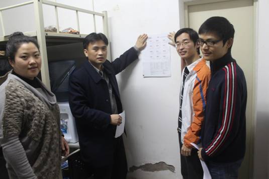 2月24日晚8时,香香腐宅 院长助理雷凯,办公室副主任杨柳,学工老师卢志明,行政助理刘立以及学院研究生会干部等,深入学院学生宿舍,看望慰问同学,与同学们进行亲切交谈,并赠送印有学院老师联系方式的新年年历。