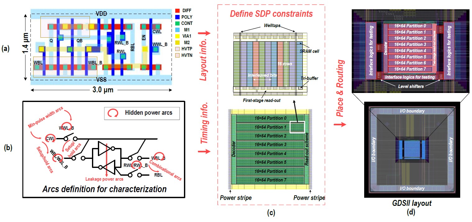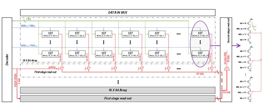 该研究首先提出并实现一种支持比特交织功能的低电压低功耗SRAM存储结构,并且改善了存储电路的结构,优化了芯片的静态功耗和动态功耗。在电路设计中,该研究抛弃了传统存储器中的模拟模块,采用纯数字电路的形式简化了存储器的内部操作,在超低电压下依旧可以保持正常工作,这些都有助于延长芯片整体的续航能力。另外,该研究还提出了与之对应的半定制设计流程。相较于传统的全定制设计流程,该流程在保证比特交织功能的同时,使得存储器的迭代设计周期大大缩短,同时也在存储器设计中引入了更多的设计灵活性,为存内计算AI芯片的设计创造了新的可能性。