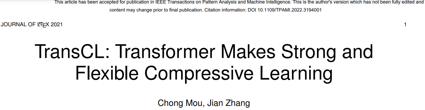 近日,张健老师课题组的一篇关于压缩学习的研究成果“TransCL: Transformer Makes Strong and Flexible Compressive Learning”被国际顶级期刊TPAMI录用(论文地址://ieeexplore.ieee.org/abstract/document/9841016)。张健老师课题组主页://villa.jianzhang.tech/。