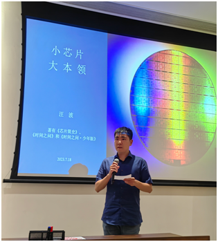 汪老师用第一人称的视角向同学们展示了芯片是什么,向同学们展示了一块封装的芯片模型,通过对芯片在普通生活场景里的应用,让同学们认识到芯片无处不在,汪老师生动的讲解激发了同学们对芯片的好奇心,积极回答老师提出的问题。从量子物理到半导体,从晶体管到集成电路,汪老师由浅入深的向同学们揭开了芯片的魔力。