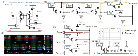 图4. 提出的11T SRAM单元 (a) 原理图 (b) 单元版图 (c) 行向读操作 (d) 列向读操作 (e) 列向逻辑运算操作 (f) 行向逻辑运算操作。