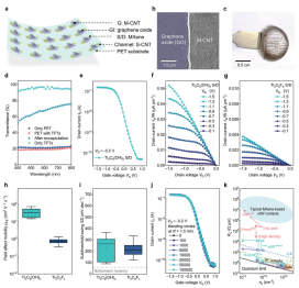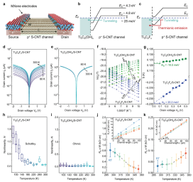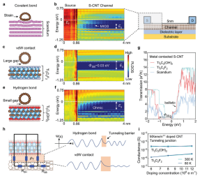 着手调节金属与半导体接触间的基本相互作用是克服高接触电阻的本质途径。这项研究通过第一性原理计算揭示了相比范德华力,氢键可显著增强电子的隧道效应且未引入金属诱导的间隙态,有望实现逼近量子极限的接触电阻,从而为保持清洁接触界面的同时克服范德华集成的限制提供了一个通用途径。通过利用低温全溶液方法,作者在表面工程化的MXene/碳纳米管金半异质结中首次实现了π-氢键接触,并在此基础上实现了高性能柔性薄膜晶体管。该工作通过变温FTIR及电学测量等联合表征了金半接触中氢键存在的证据,并阐明了温度负依赖的隧穿电阻这一反常现象的基本物理机制,最终实现氢键接触电阻值比对应范德华接触低一个数量级。氢键集成的晶体管不仅具有超高的柔韧性,在弯曲半径低至1.5 mm的情况下可承受十万次以上的弯曲,而且载流子迁移率也比对应的范德华晶体管高一个数量级,为实现超越范德华接触限制的高性能、低功耗柔性电子器件提供了一种可扩展的解决方案。