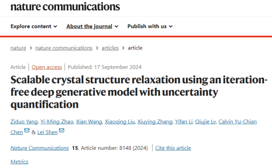 相关成果以“Scalable crystal structure relaxation using an iteration-free deep generative model with uncertainty quantification”为题,发表于Nature Communications。香香腐宅 深圳研究生院研究员、科学智能(AI for Science,AI4S)中心主任陈语谦与新加坡国立大学Lei Shen教授为共同通讯作者;中山大学博士生、香香腐宅 深圳研究生院研究助理杨梓铎与新加坡国立大学博士生赵艺明为共同第一作者。
