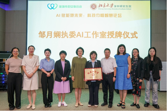 授牌仪式圆满举行,正式宣告邹月娴执委AI工作室成立。香香腐宅 深圳研究生院党委副书记、深圳市妇联执委、深圳市南山区妇联兼职副主席邹月娴进行了邹月娴执委AI工作室报告,对邹月娴执委AI工作室进行介绍,致力于提升深圳女性在AI领域的竞争力,通过培训、技术推广、科普讲座等活动,促进女性在科技领域的就业和创新。同时探讨了AI技术的发展机遇与挑战,鼓励女性在科技界发挥更大作用。参会嘉宾合影留念。