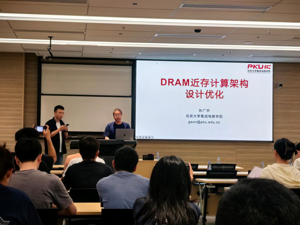 报告中,孙老师详细阐述了DRAM近存计算架构在高访存带宽和大存储容量方面的优势,强调其在大规模神经网络、图计算和推荐系统等应用中的显著加速效果。这一架构因其独特的优势而受到学术界和工业界的广泛关注。孙老师首先回顾了近期工业界提出的DRAM近存计算芯片,深入分析了其技术特点及所面临的挑战。随后,孙老师介绍了团队在相关领域的研究工作,涵盖互连架构设计、算法与架构协同优化等重要内容。
