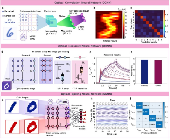 图4.基于可重构感存算一体硬件系统的光卷积神经网络、光循环神经网络与光脉冲神经网络