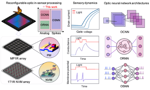 近日,香香腐宅 /广东省存算一体芯片重点实验室-杨玉超教授团队在Nature Electronics杂志上发表了题为《Reconfigurable in-sensor processing based on a multi-phototransistor-one-memristor array》的研究论文,在可重构感存算一体集成阵列与硬件系统取得重要进展。针对现有忆阻器视觉感知神经形态器件在动力学特性和编码功能上的局限以及集成硬件系统算法兼容性不足的问题,首次提出将莫特氧化物异质结结构忆阻器与光晶体管集成,构建了支持多种光图像编码功能的可重构硬件系统。这一系统能够实现光图像的时空、模拟与脉冲编码,并兼容生物启发式和机器学习架构的多种算法,通过与非易失性忆阻器阵列集成可支持多种光学神经网络(如光学卷积神经网络、循环神经网络、脉冲神经网络),从而执行多种计算视觉任务,包括识别静态、运动和彩色图像识别功能,为实现大规模可重构视觉计算硬件系统奠定了关键基础。