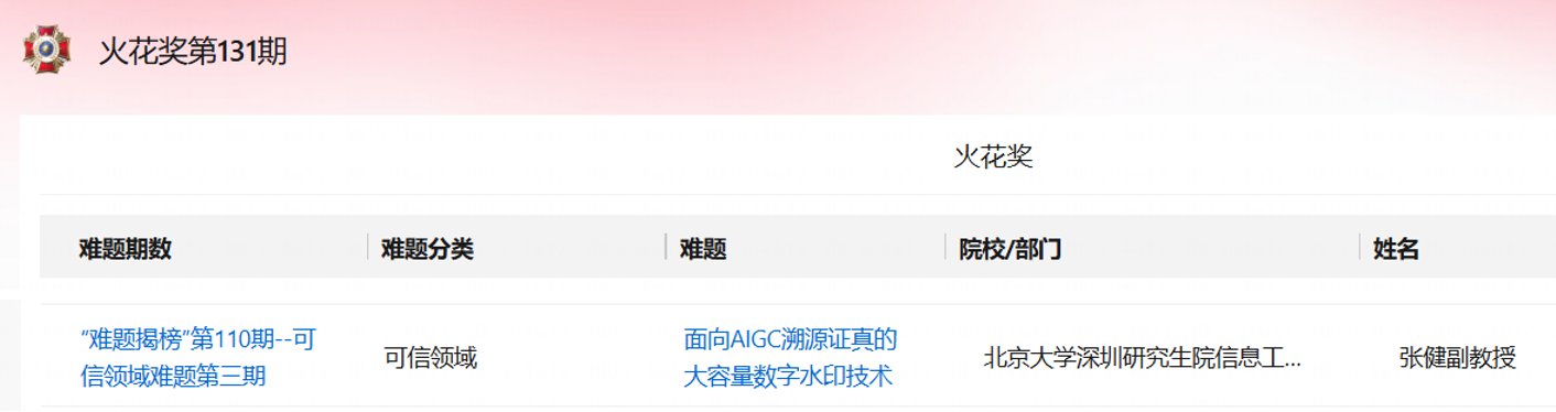 张健老师针对第110期难题揭榜-可信领域第三期-难题5:面向AIGC溯源证真的大容量数字水印技术,提出一套自主研发的水印技术方案,融合了高压缩率信息编码与大容量可逆隐写技术,有效提升了信息嵌入的密度与隐蔽性,各项性能均满足全部技术指标要求。