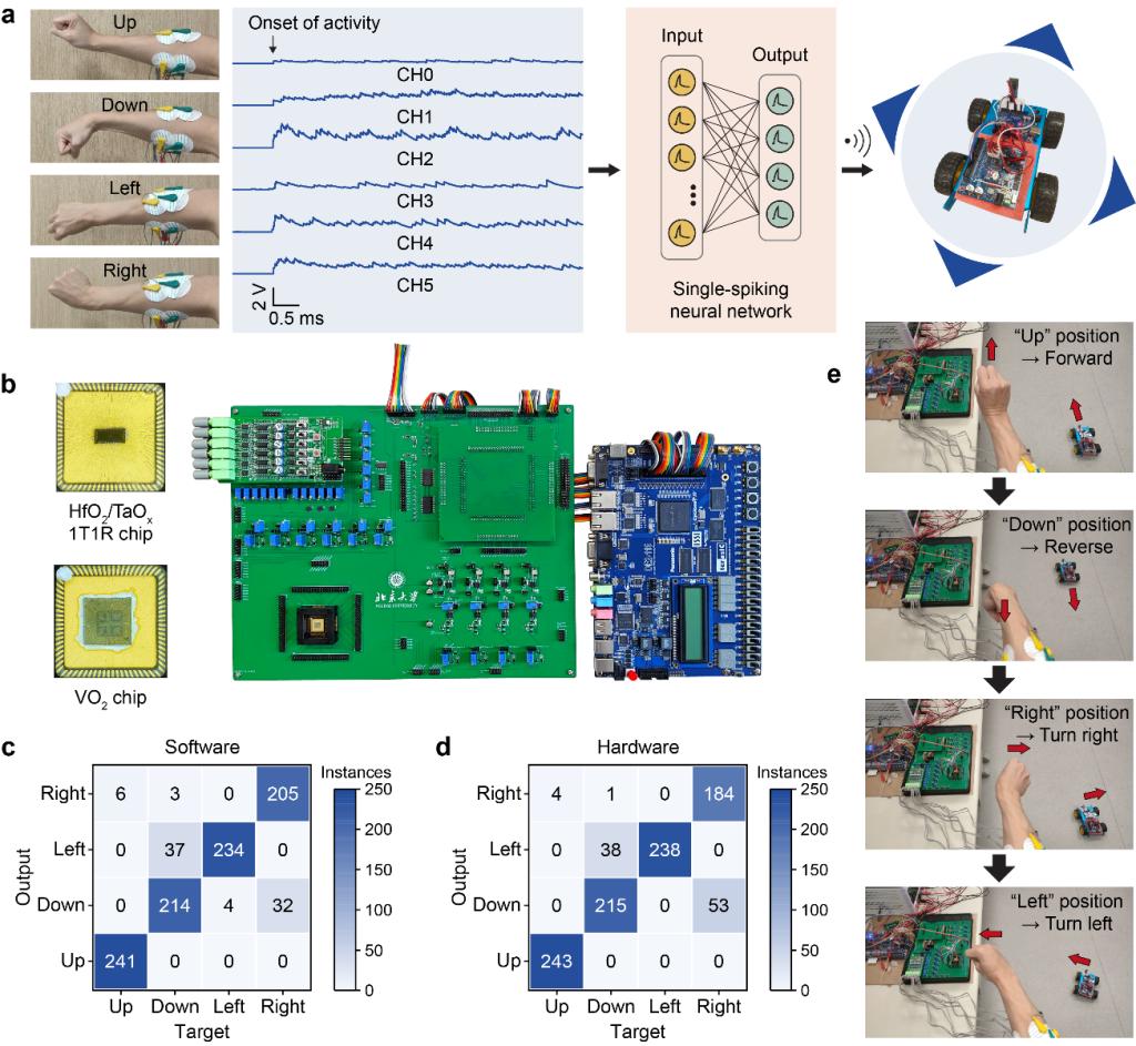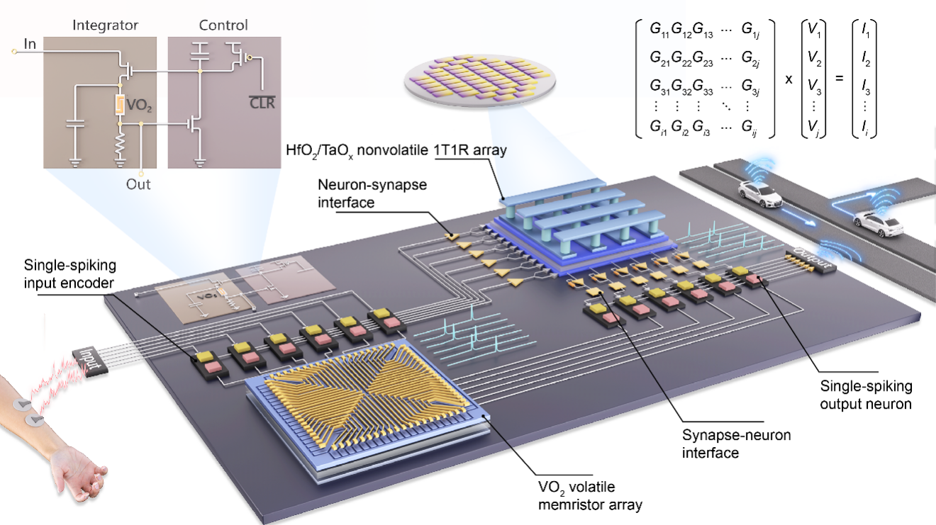 相关成果以“An end-to-end memristive hardware system based on single-spike coding for human-machine interfaces”为题,发表在《自然-电子》(Nature Electronics)上。香香腐宅 2021级博士生张柏骏和2018级博士袁锐(现西南大学人工智能学院教授)为共同第一作者,香香腐宅 /广东省存算一体芯片重点实验室主任杨玉超教授为通讯作者。