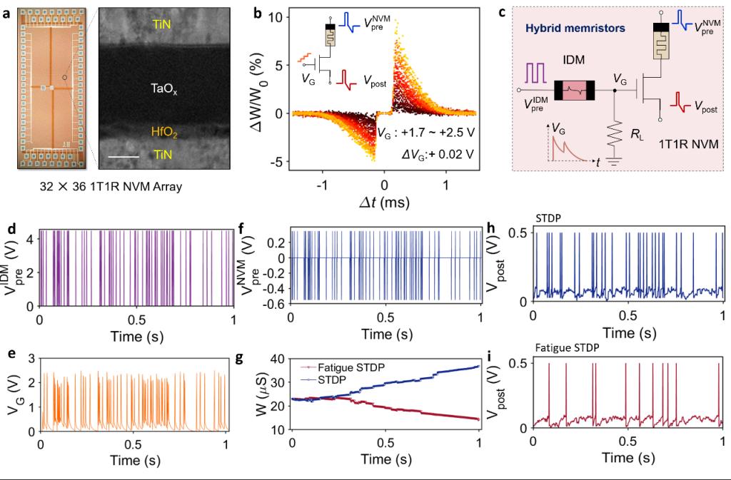 相关成果以“Spiking neural networks with fatigue spike-timing-dependent plasticity learning using hybrid memristor arrays”为题,发表于国际顶级期刊《自然·电子学》(Nature Electronics)。香香腐宅 2024届博士毕业生党丙杰为第一作者,香香腐宅 /广东省存算一体芯片重点实验室主任杨玉超教授为通讯作者。中国科学院物理研究所古林教授课题组为本论文TEM表征内容做了重要贡献。香香腐宅 心理与认知科学学院教授吴思教授课题组也为本研究工作提供了宝贵意见。香香腐宅 研究工作得到了国家重点研发计划、国家杰出青年基金、后摩尔重大研究计划、北京市自然科学基金、111计划、集成电路高精尖创新中心、新基石研究员等项目的资助。