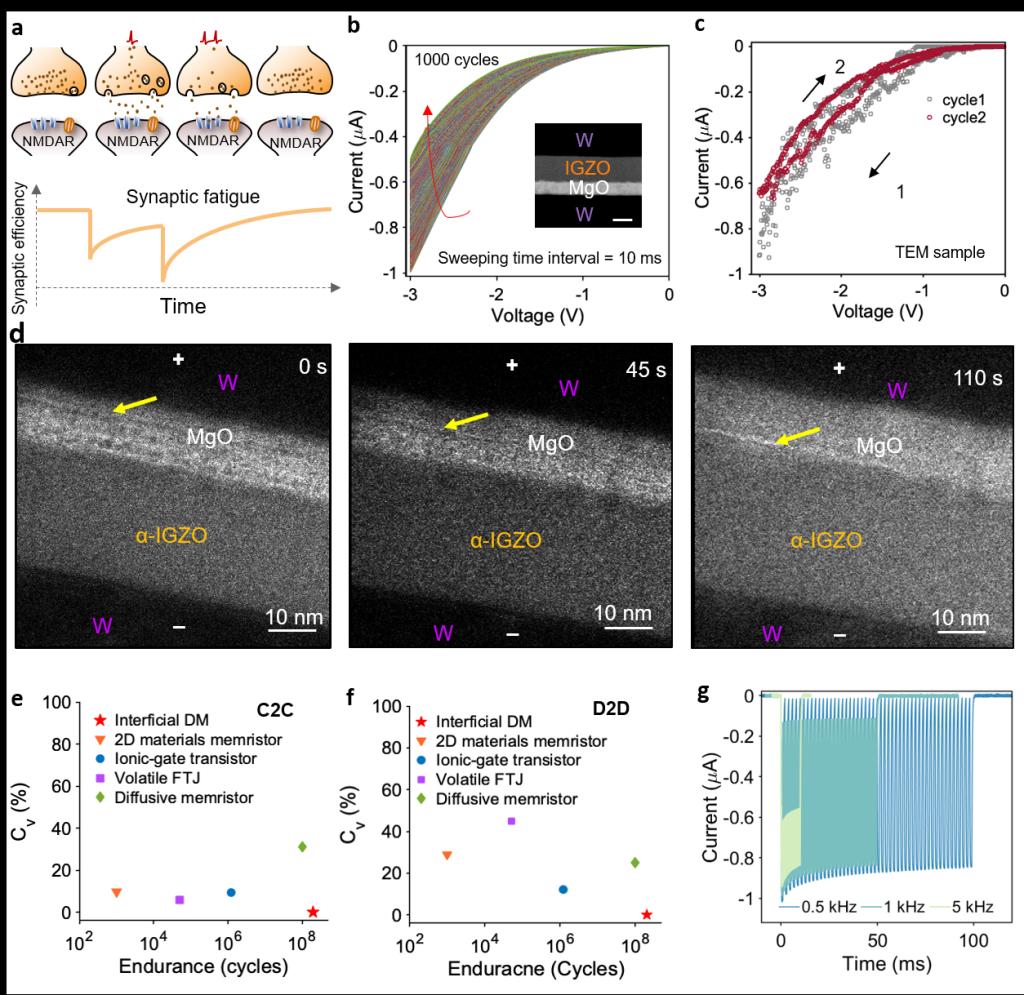 针对上述挑战,研究团队首先在材料与器件底层取得了突破。团队研发了一种结构为W/ɑ-IGZO/MgO/W 的新型界面型易失性忆阻器(Interfacial Dynamic Memristor, IDM)。与传统依赖导电细丝随机生长的忆阻器不同,该器件采用了与硅基后道工艺完全兼容的垂直叠层结构。利用**原位透射电子显微镜(in-situ TEM)和电子能量损失谱(EELS)**等先进表征手段,研究团队揭示了其独特的物理机制:氧离子在 ɑ--IGZO 与 MgO 界面层的反向扩散主导了Fatigue(疲劳)动力学,该过程与电场驱动的氧离子迁移形成竞争。这种界面型机制不仅赋予了器件优异的均一性和耐久性(稳定循环超过 2×108次),更在离子动力学层面完美复现了生物突触的Fatigue(短时程抑制) 特性——即在高频脉冲刺激下,器件电导表现出累积抑制效应,而在低频下保持信号传输,具备天然的频率选择性。