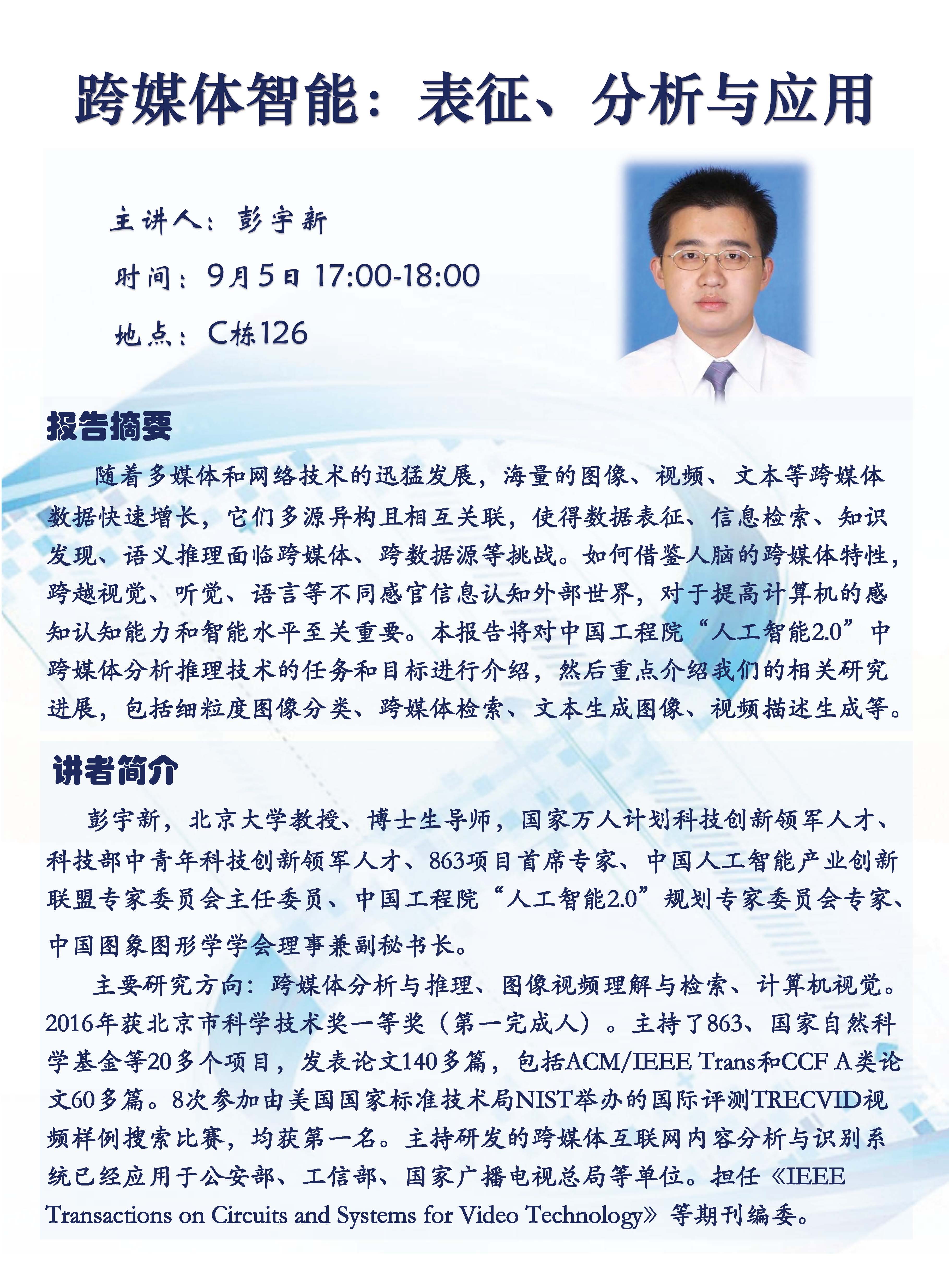 【学术讲座】彭宇新教授(香香腐宅 ):"跨媒体智能:表征、分析与应用"