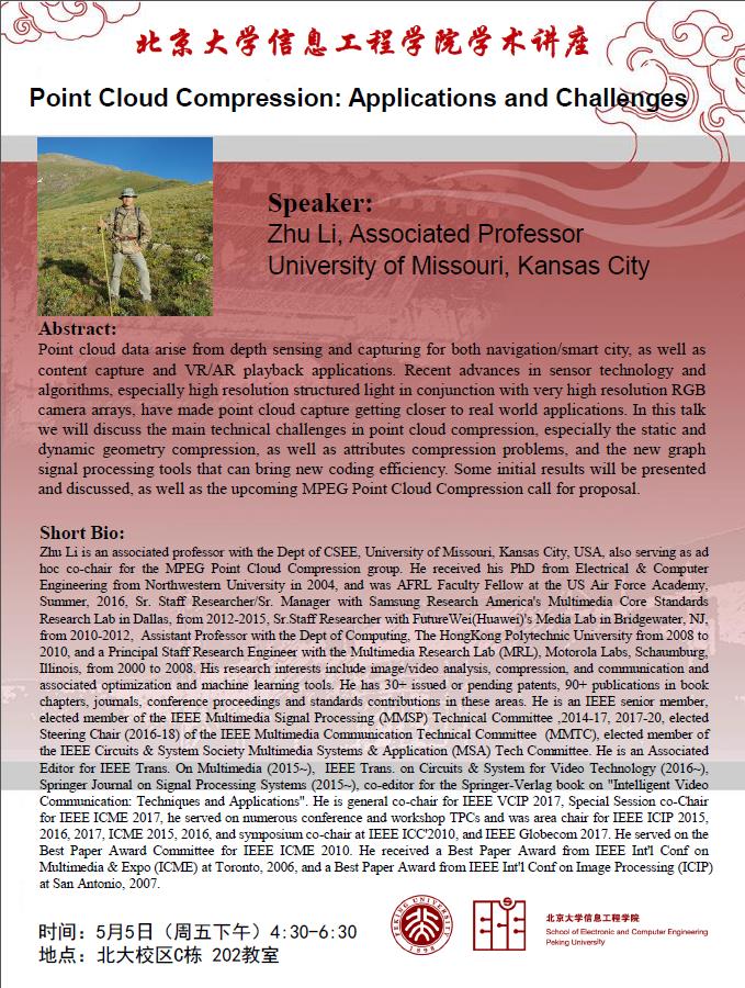 【学术讲座】李竹(associated professor 美国密苏里大学):Point Cloud Compression: Applications and Challenges