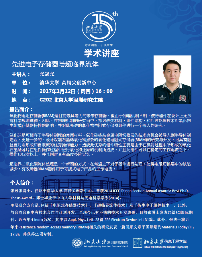 【学术讲座】张冠张博士(清华大学 高精尖创新中心):先进电子存储器与超临界流体