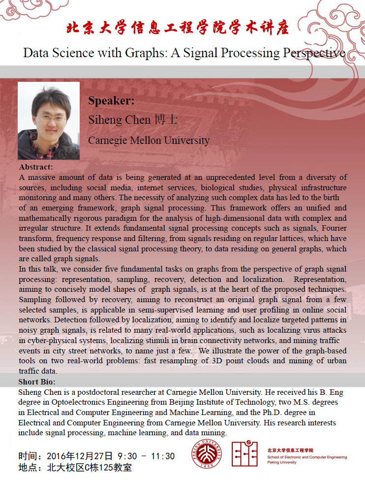 【学术讲座】Siheng Chen 博士 Carnegie Mellon University:Data Science with Graphs: A Signal Processing Perspective