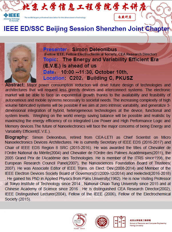 【学术讲座】Simon Deleonibus (Fellow IEEE, Fellow Electrochemical Society, CEA Research Director)The Energy and Variability Efficient Era(E.V.E.