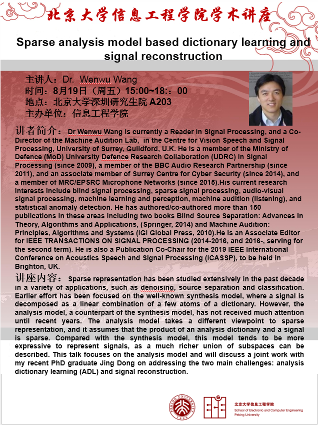 【学术讲座】Dr. Wenwu Wang:Sparse analysis model based dictionary learning and signal reconstruction