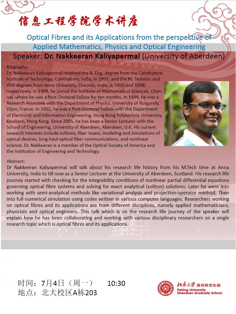 【学术讲座】Dr. Nakkeeran Kaliyapermal (University of Aberdeen):Optical Fibres and its Applications from the perspective of Applied Mathematic