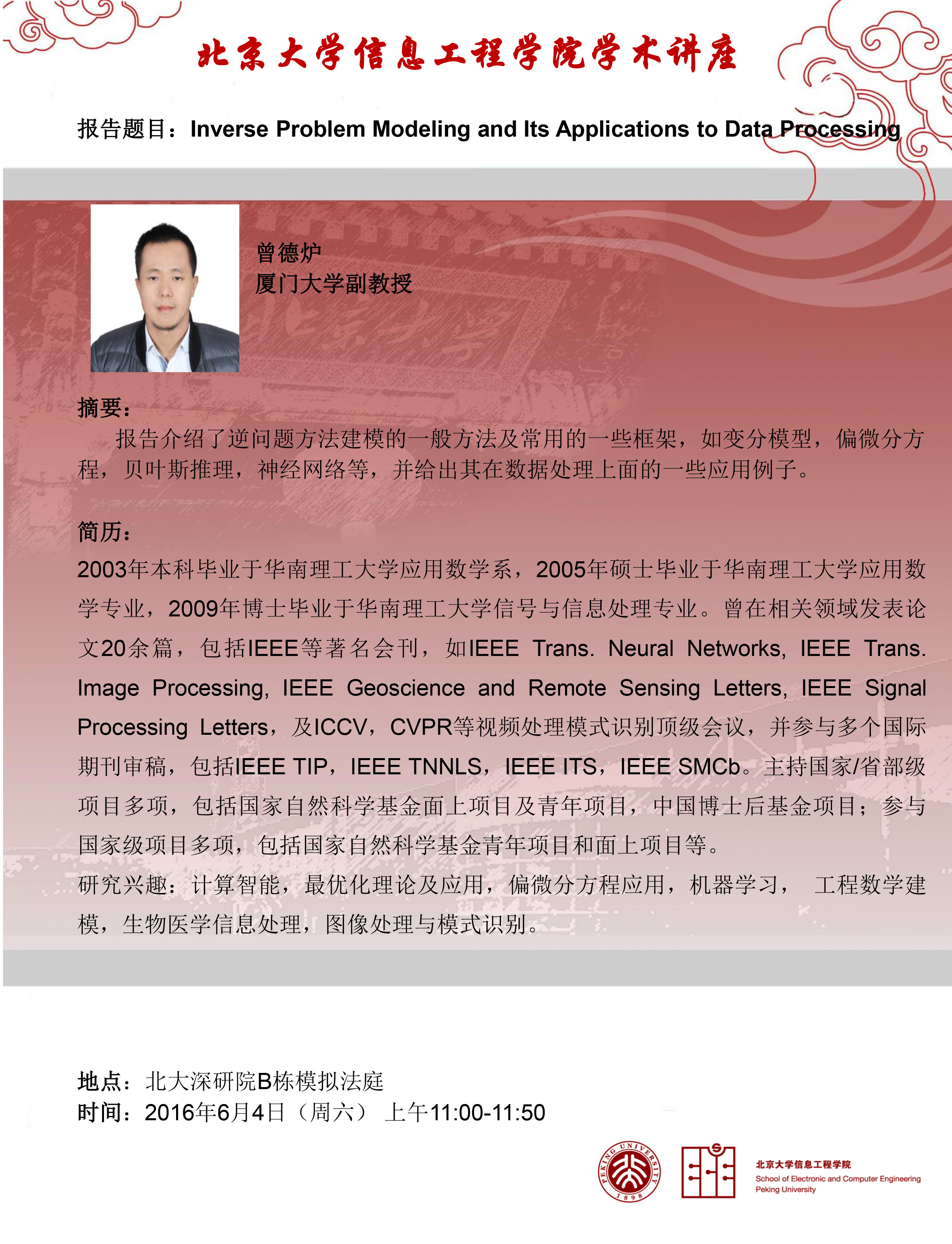 【学术讲座】曾德炉 副教授(厦门大学):Inverse Problem Modeling and Its Applications to Data Processing