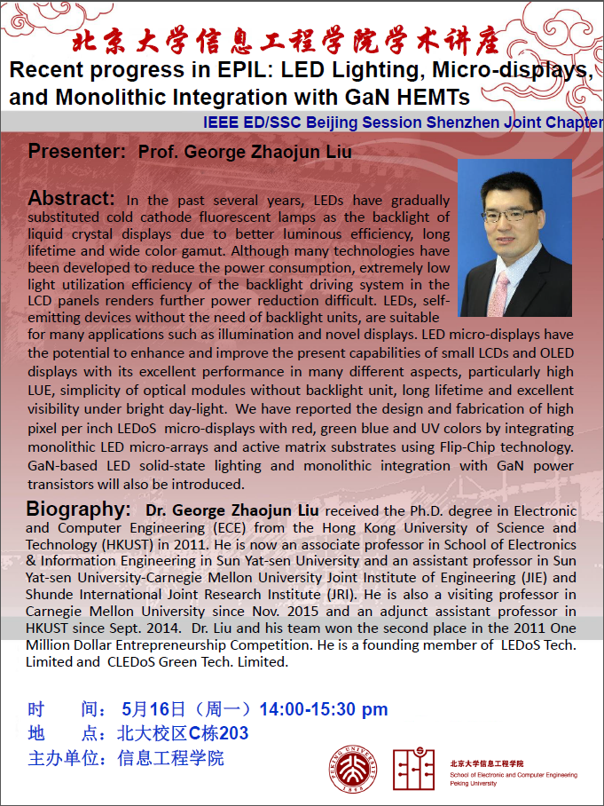 【学术讲座】Prof.George Zhaojun Liu :Recent progress in EPIL: LED Lighting, Micro-displays, and Monolithic Integration with GaN HEMTs