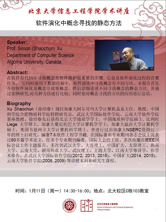【学术讲座】Prof. Simon Xu(Algoma University):软件演化中概念寻找的静态方法