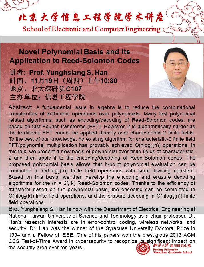【学术讲座】韩永祥教授(台科大/IEEE Fellow):Novel Polynomial Basis and Its Application to Reed-Solomon Codes