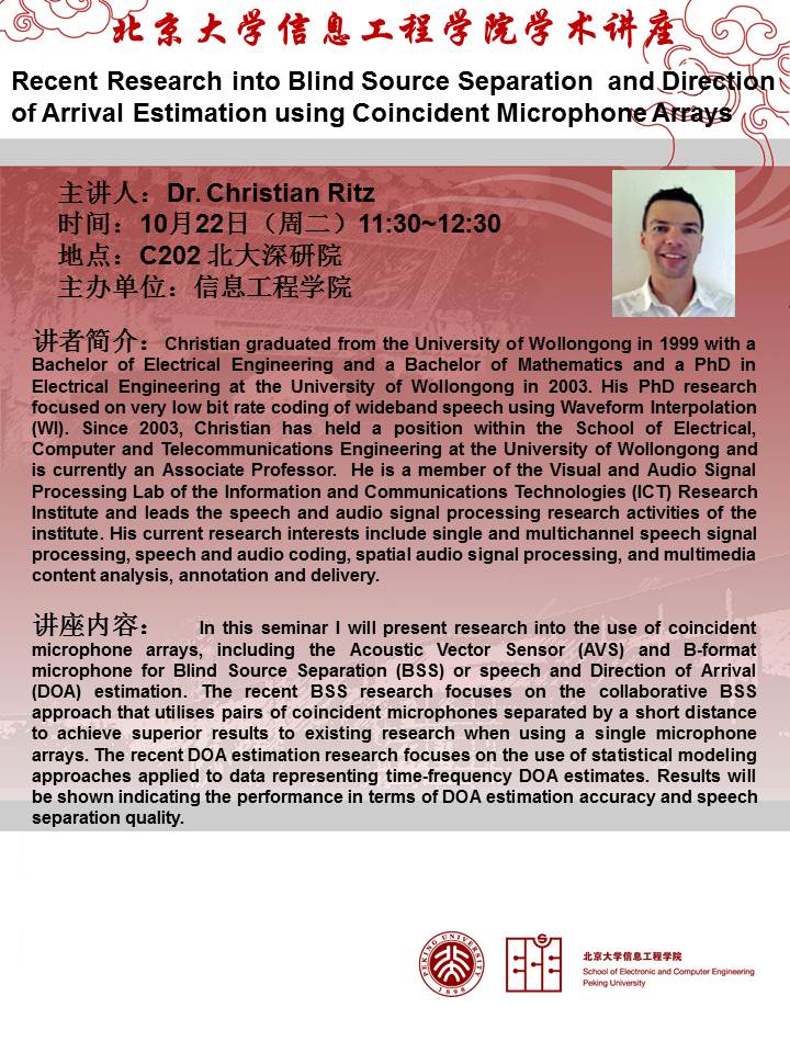 【学术讲座】Dr. Christian Ritz:Recent Research into Blind Source Separation and Direction of Arrival Estimation using Coincident Microphone Arr