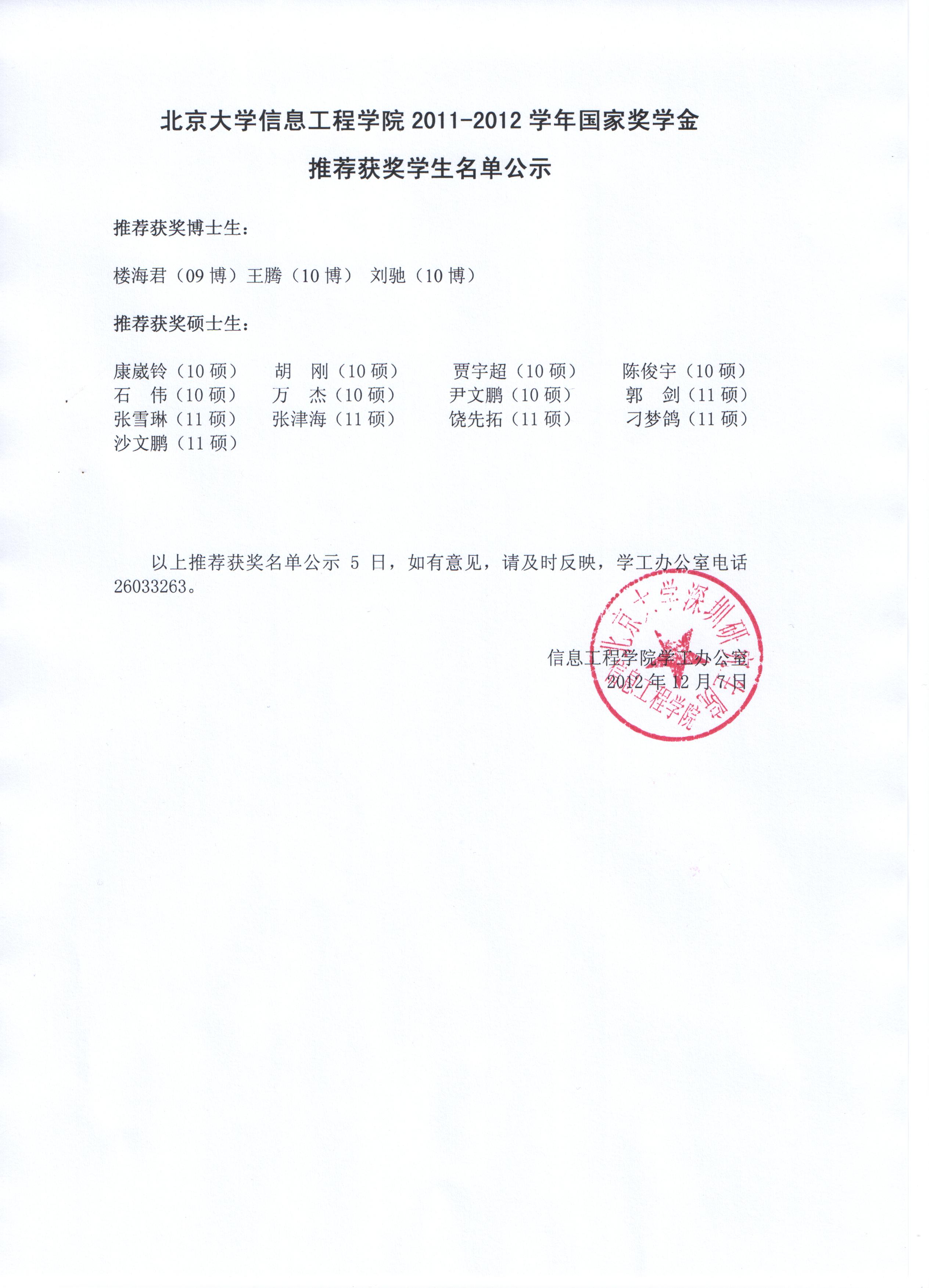 香香腐宅 2011—2012学年国家奖学金推荐获奖名单公示