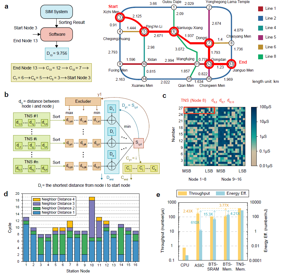 该系统基于实际流片的忆阻器芯片,结合PCB与FPGA搭建了端到端的板卡级应用演示系统,全面验证了其在多种典型排序任务中的优越性能。实验结果显示,相较于当前主流ASIC排序系统,该系统在5类代表性数据集上实现了高达7.70倍的速度提升、160.4倍的能效提升和32.46倍的面积效率提升,充分展现出存算一体架构在大数据排序场景中的巨大潜力。研究团队进一步还将该系统应用于两个实际任务中验证了系统的实用性与通用性:在Dijkstra路径规划应用中,基于TNS排序系统成功实现了北京地铁16个站点之间的最短路径求解,不仅保持运算准确性,还大幅降低延迟和功耗;在神经网络推理中,团队将TNS与忆阻器矩阵向量乘法计算融合,在PointNet++网络上实现了实时原位稀疏(run-time tunable sparsity),可根据推理精度需求灵活控制稀疏度,提升系统效率并同时降低计算开销。相较于传统ASIC排序系统,可以提升15倍的速度和67.1倍的能效。