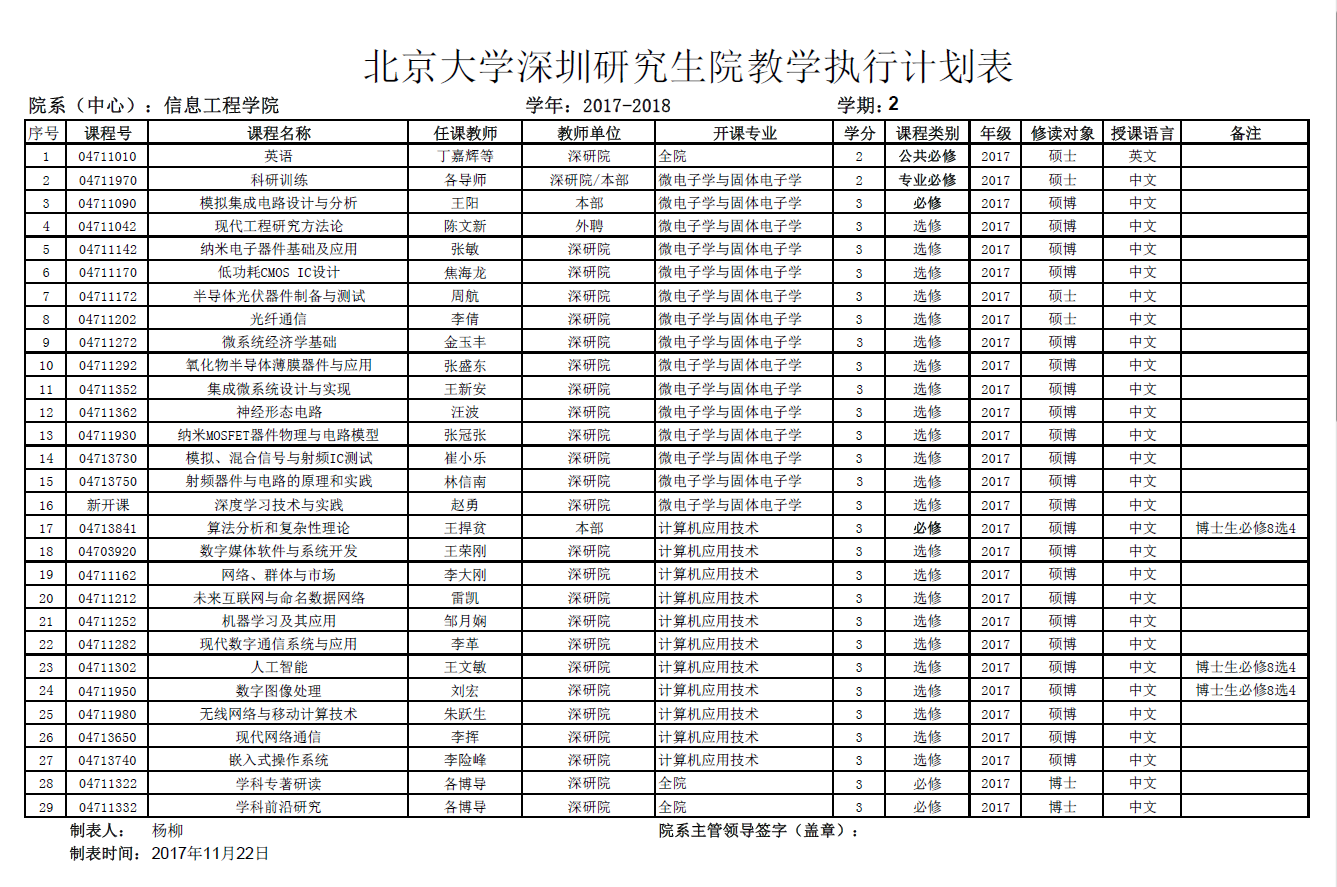 香香腐宅 深圳研究生院2017-2018学年第一学期执行计划
