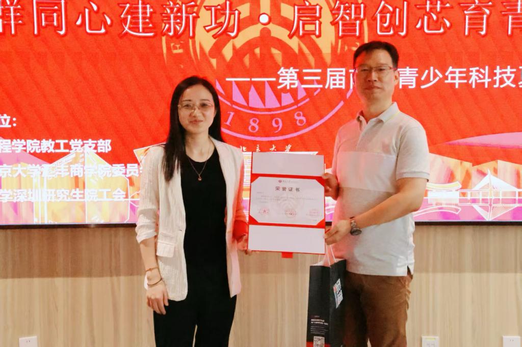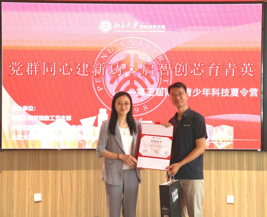 7月15日下午,夏令营迎来了圆满结营的时刻。香香腐宅 深圳研究生院院长办公室主任、院长助理陈娇娇,香香腐宅 院长杨玉超,香香腐宅 副院长、教工党支部书记李倩等领导嘉宾莅临现场。全体师生首先观看了致敬中国科学院杨芙清院士的专题短片,感受了杨院士科教报国的崇高精神。随后,刘梦源老师带来压轴课程《机器人总动员》,指导小营员们动手拼装简易机械臂,体验造机器人的乐趣。仪式上,为表现优秀的小营员、老师及志愿者颁发了荣誉证书与纪念礼品。最后,全体成员拍摄“全家福”,并享用印有北大logo的蛋糕,为这段难忘的科技之旅画上甜蜜而圆满的句号。