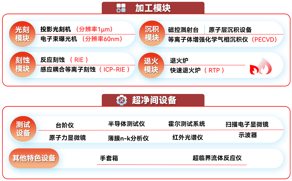 平台配备了80余台/套半导体和集成电路微纳加工相关的设备仪器,设备原值超过三千万元,具备完备的工艺模块。