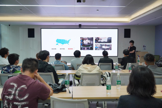 下午1点,郝丹老师带领同学们参观深圳科创学院,被誉为"大湾区硬科技创业者的摇篮"。走进科创学院的产品展示中心,仿佛置身于一座"微型科技博物馆"。展厅内,十余家入驻企业的拳头产品依次陈列,每一件都代表着某个细分领域的突破性进展。深圳科创学院对外合作总监卓宇迎老师以该院培育硬科技企业的实战经验为引,深入解析了“如何通过新工科教育重构人才培养链路”,并描绘了一幅“政产学研资用”协同的科创新生态蓝图——从入驻团队的成长数据到生态链资源聚合逻辑,卓老师的分享既有实战案例的温度,又有战略布局的高度。