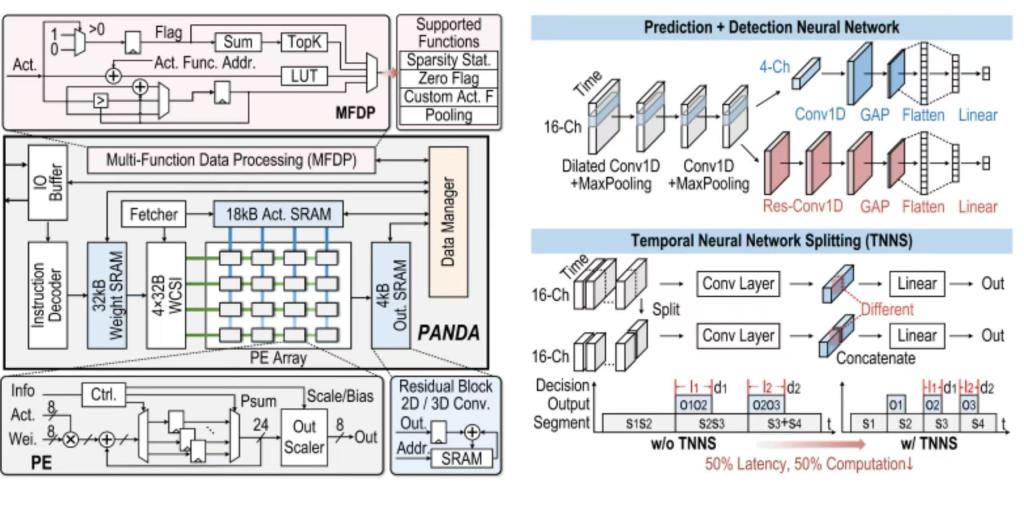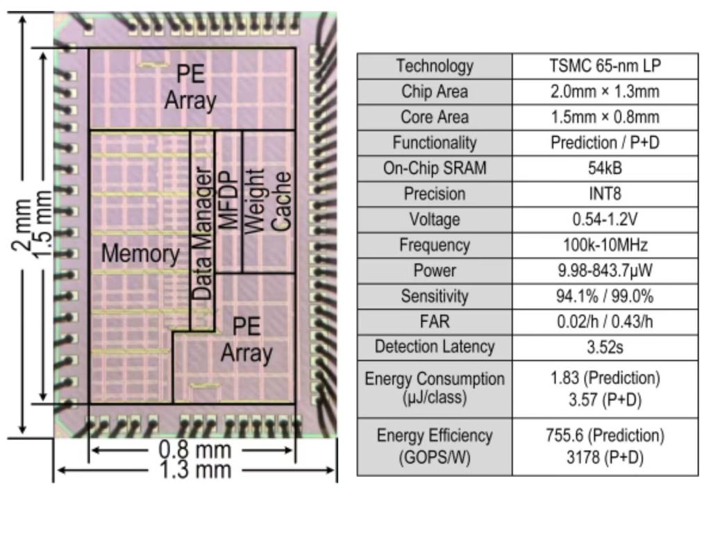 癫痫是一种由脑神经元异常放电引发的慢性神经系统疾病,全球患者人数超过6500万。由于癫痫发作具有突发性和不可控性,患者时刻面临着健康风险。可穿戴智能设备对于癫痫患者在非医院环境下的健康监测至关重要。此类设备提供的长期实时癫痫发作监测能显著降低看护成本,同时提升患者的生活质量。此次香香腐宅 的研究工作旨在解决当前用于超低功耗可穿戴智能设备的癫痫监测处理器在癫痫识别性能与能耗之间难以兼顾的问题。该研究工作开发了一种可配置的癫痫预测+检测神经网络加速器PANDA。该研究提出了一种轻量级预测+检测癫痫监测框架,在保证高分类性能的同时实现了低计算复杂度。并通过采用时序神经网络分割技术,有效降低了计算延迟与计算量。加速器采用通道优先、输出固定数据流架构,结合激活值跳零技术和通过统计信息优化的权重缓存,显著提升了加速器的能效。此外,通过自定义指令集设计,该加速器具备高度可配置性,可灵活支持不同神经网络的部署。该工作采用了65纳米工艺进行了流片验证。在癫痫监测任务中,芯片实现99%的灵敏度、0.43次/小时的误报率,以及最高3.178TOPS/W的能效表现,达到国际领先水平。